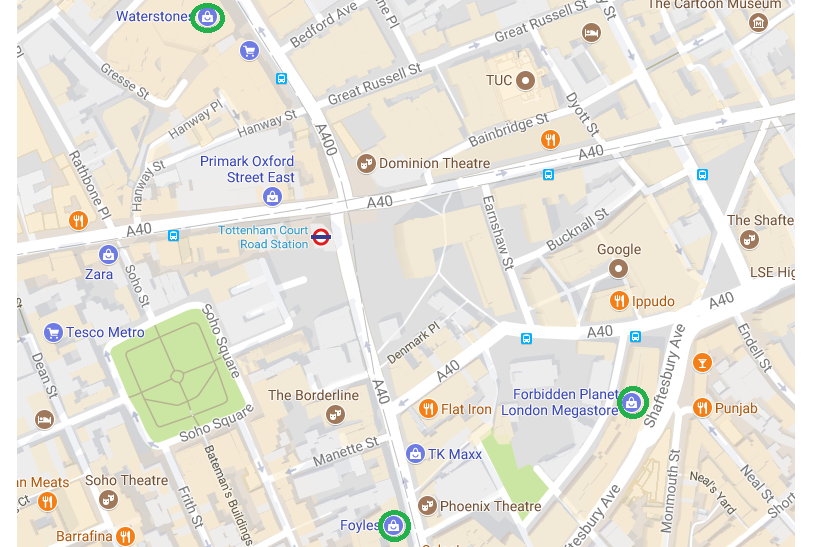 De tre boghandlers placering (Kilde: https://www.google.dk/maps/@51.5158395,-0.1308563,17z)