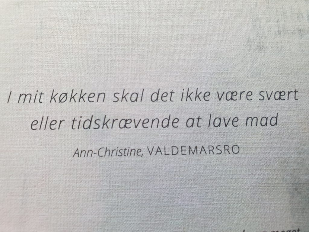 Her skal det nævnes, at man ikke skal forvente overdådige kullinariske oplevelser fra denne bog. Maden er lækker og simpel aftensmad, som vil tiltale flertallet. Retterne er alle nogen vi kender, men måske ikke lige kan huske, eller måske gerne vil udvikle videre.